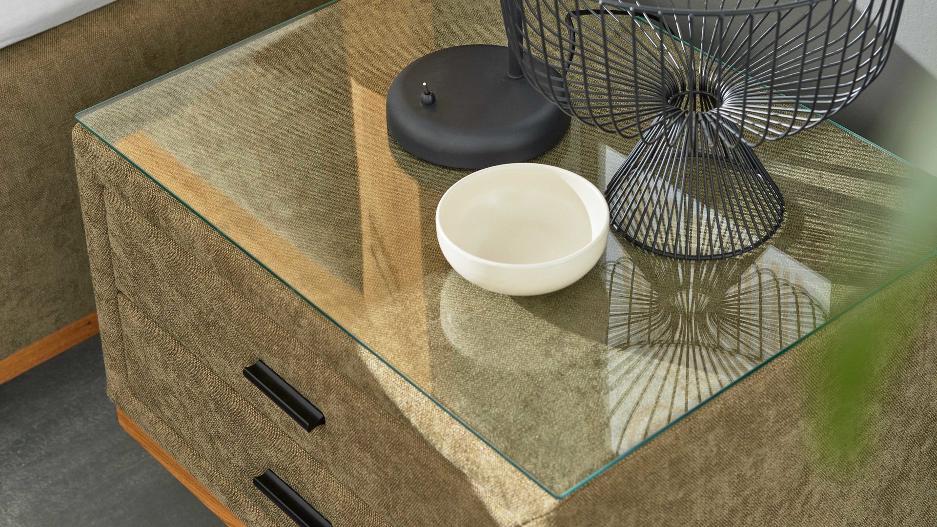 Ein echtes Highlight ist die Klarglasplatte, die als stilvolle Ablagefläche dient – ideal für deine Nachttischlampe, ein Glas Wasser oder deine Lieblingslektüre. Durch die bodenfreie Konstruktion wirkt die Nachtkommode besonders leicht und elegant.