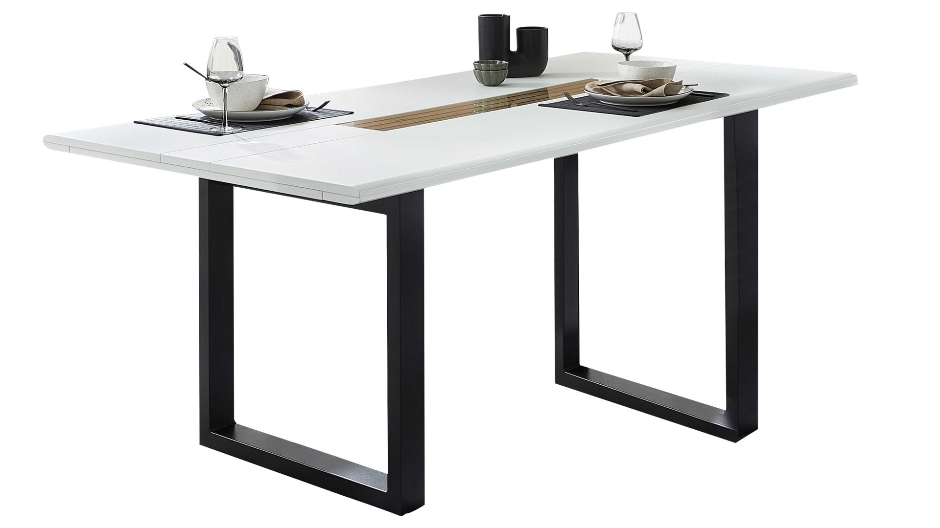 mattweiße Tischplatte, kombiniert mit Artisan Eiche-Nachbildung und mattschwarzem Metall
