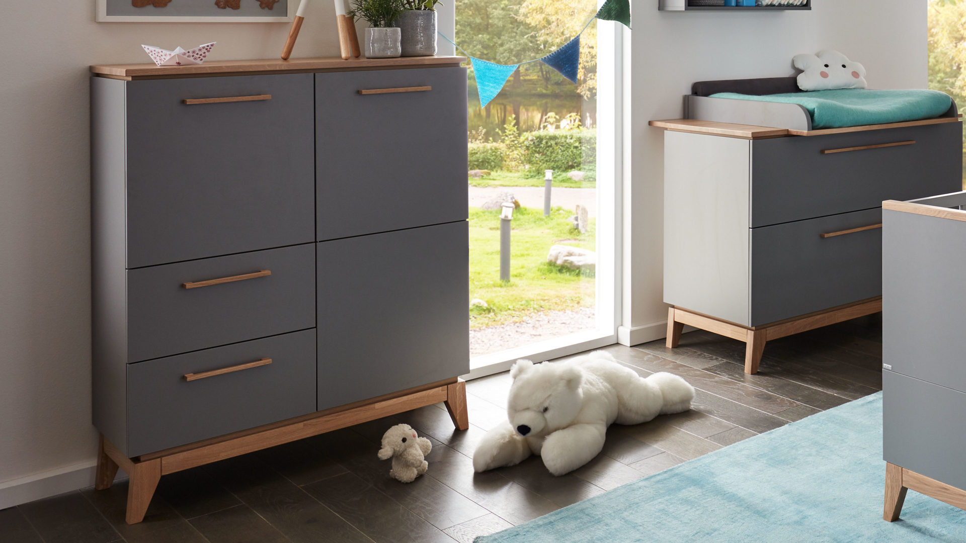Farbe schiefergraue Melaminoberflächen mit massive Eiche
