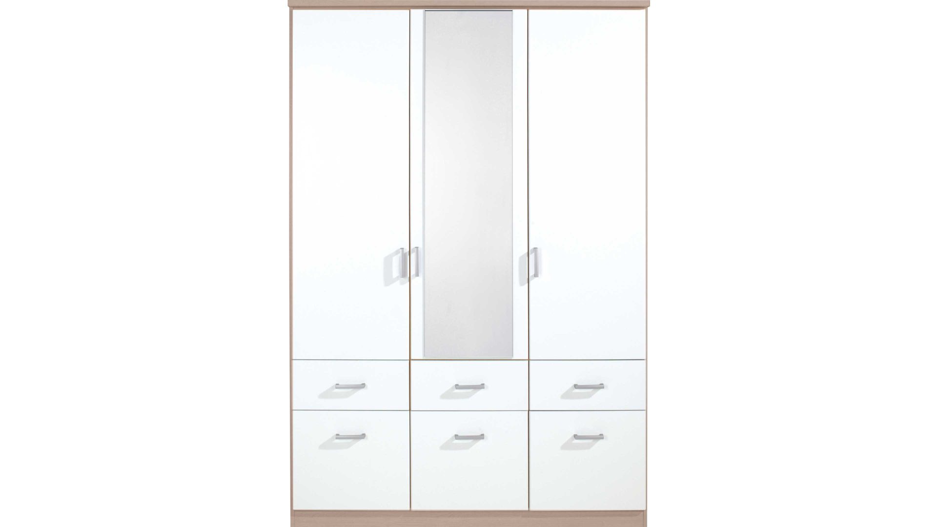 drei Schubladen, vier Kleiderböden und zwei Metall-Kleiderstangen