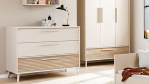 gerillte Eichenholz-Nachbildung Groovy-Oak, kombiniert mit Cashmere-beigem Mattlack