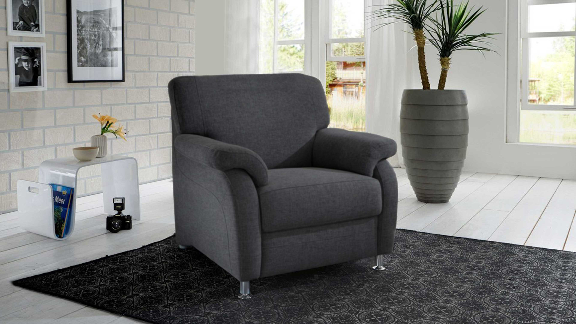 Dank des klassischen anthrazitfarbenen und überaus pflegeleichten CleverCleanbezugs und den dezenten Alufüßen erhält er eine moderne und zugleich ausgesprochen elegante Optik. Kombiniere Sie den Sessel mit strahlendem Weiß oder mit dezenten Holztönen. Ihnen sind keine Grenzen gesetzt. Mit seiner aufwendigen Polsterung bietet er außerdem höchsten Sitzkomfort.