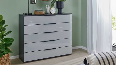 Modern, praktisch, hochwertig: Die Schubladenkommode aus der Interliving Schlafzimmer Serie 1033 verbindet ein klares, zeitgemäßes Design mit komfortabler Funktionalität. Der weiße Korpus, hochwertige Glasfronten in Weiß und schieferfarbene Griffleisten schaffen eine elegante Optik, die sich harmonisch in jedes moderne Schlafzimmerambiente einfügt.