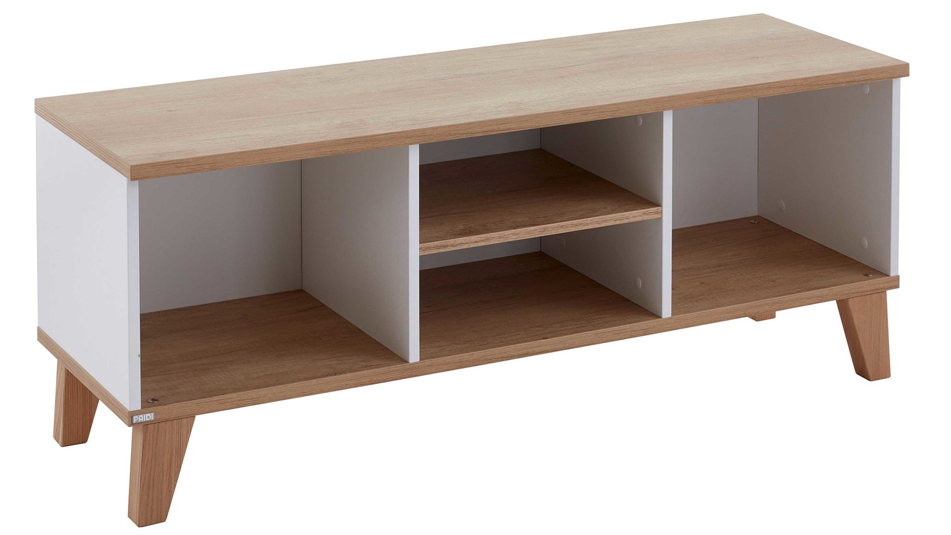 Das hochwertige PAIDI Lowboard Oscar begeistert mit der Kombination aus Nebraska-Eiche-Nachbildung und kreideweißen Melaminoberflächen. Letztere zeichnen sich durch ihre Lichtechtheit sowie die besonders ausgeprägte Kratz- und Stoßfestigkeit aus. Überdies sind sie sehr pflegeleicht. Der Holzton verströmt warmen, natürlichen Charme und harmoniert wunderbar mit dem Kreideweiß. Zusammen sorgen die Nuancen für eine moderne und elegante Optik. Robuste Massivholzfüße runden den Schrank stilsicher und stabil ab.