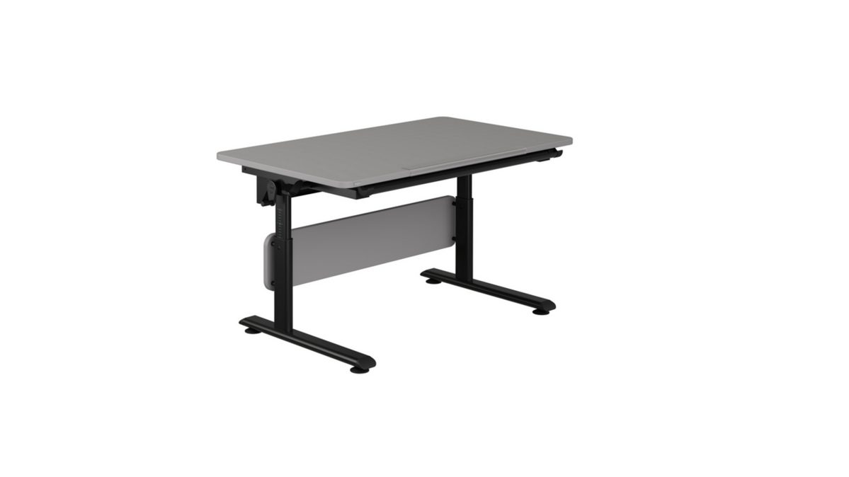 Der PAIDI Schreibtisch Diego, aus einer Platte in Schiefergrau und einem dazu passenden Metallgestell in weiß, passt besonders gut ins Kinderzimmer. Er lässt sich auch mit einem Rollcontainer oder einem Schreibtischstuhl kombinieren.