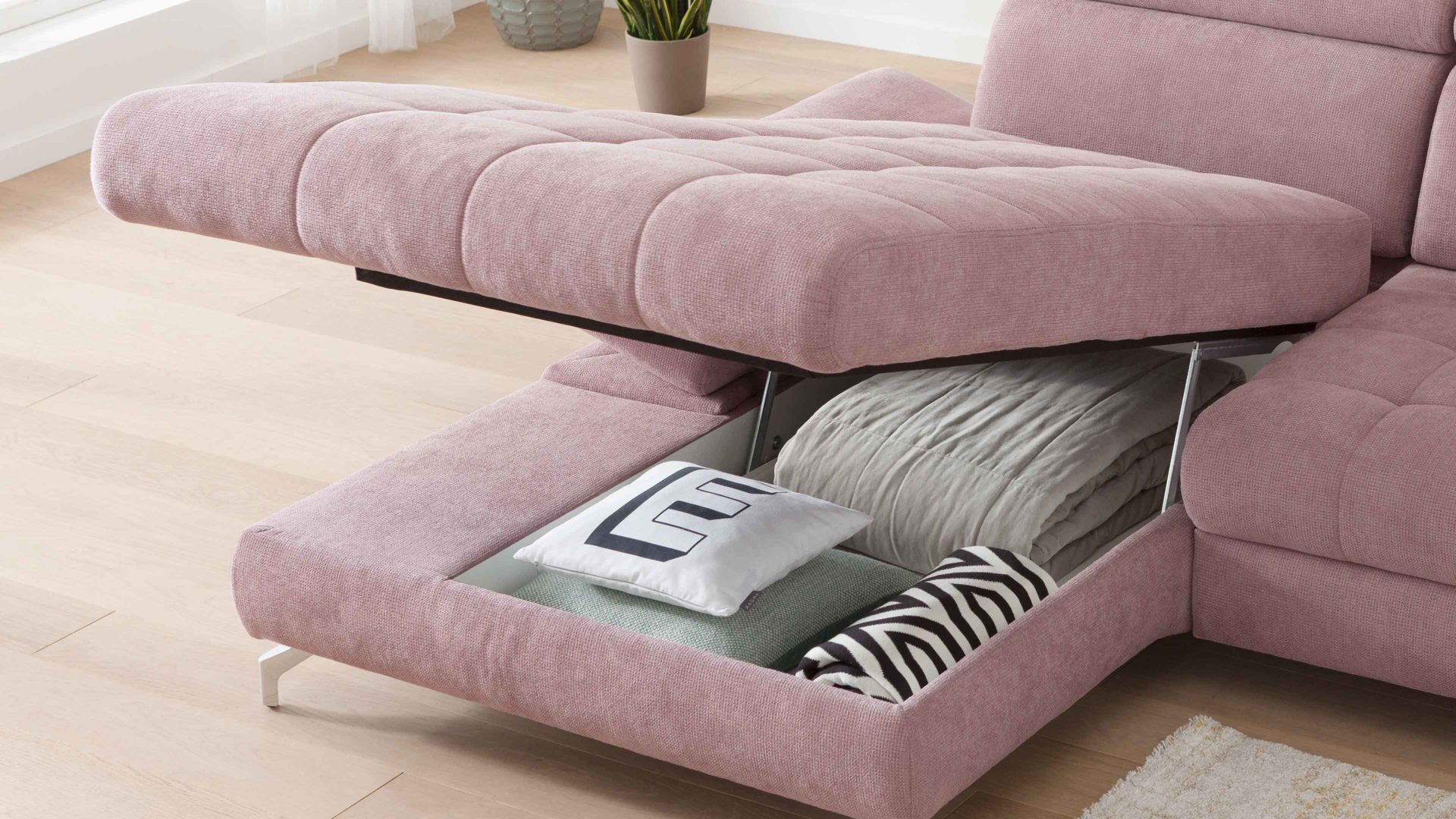 Mit der praktischen Möglichkeit, die Sitzfläche im Handumdrehen hochzuklappen und den Raum darunter zur Aufbewahrung verschiedener Gegenstände (Kuscheldecken, Zierkissenbezüge et cetera) zu nutzen, verwandelt sich der jeweilige Longchair in ein multifunktionales Möbel - flexibel einsetzbar und gemütlich. Der Mehrpreis wird pro Element berechnet.