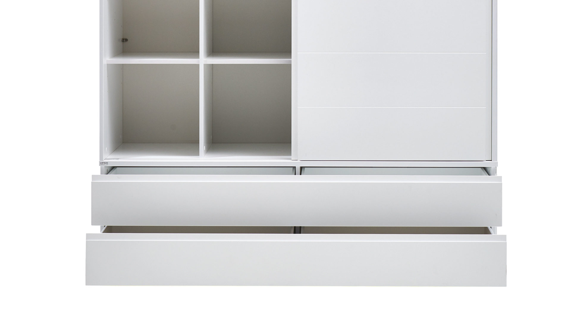 mit zwei Schiebetüren, dahinter sechs schmale Einlegeböden, ein breiter Einlegeboden und zwei Kleiderstangen