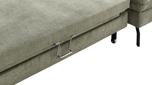 Mit der Querschläfer-Funktion verwandeln Sie die Couch schnell und einfach in ein gemütliches Gästebett für ein bis zwei Personen oder in eine vergrößerte Wohnlandschaft, auf der Sie sich noch besser entfalten und entspannen können. Die Liegefläche ist mit Polyätherschaum auf Federholzleisten gepolstert sowie mit dem olivfarbenen Originalstoff bezogen.