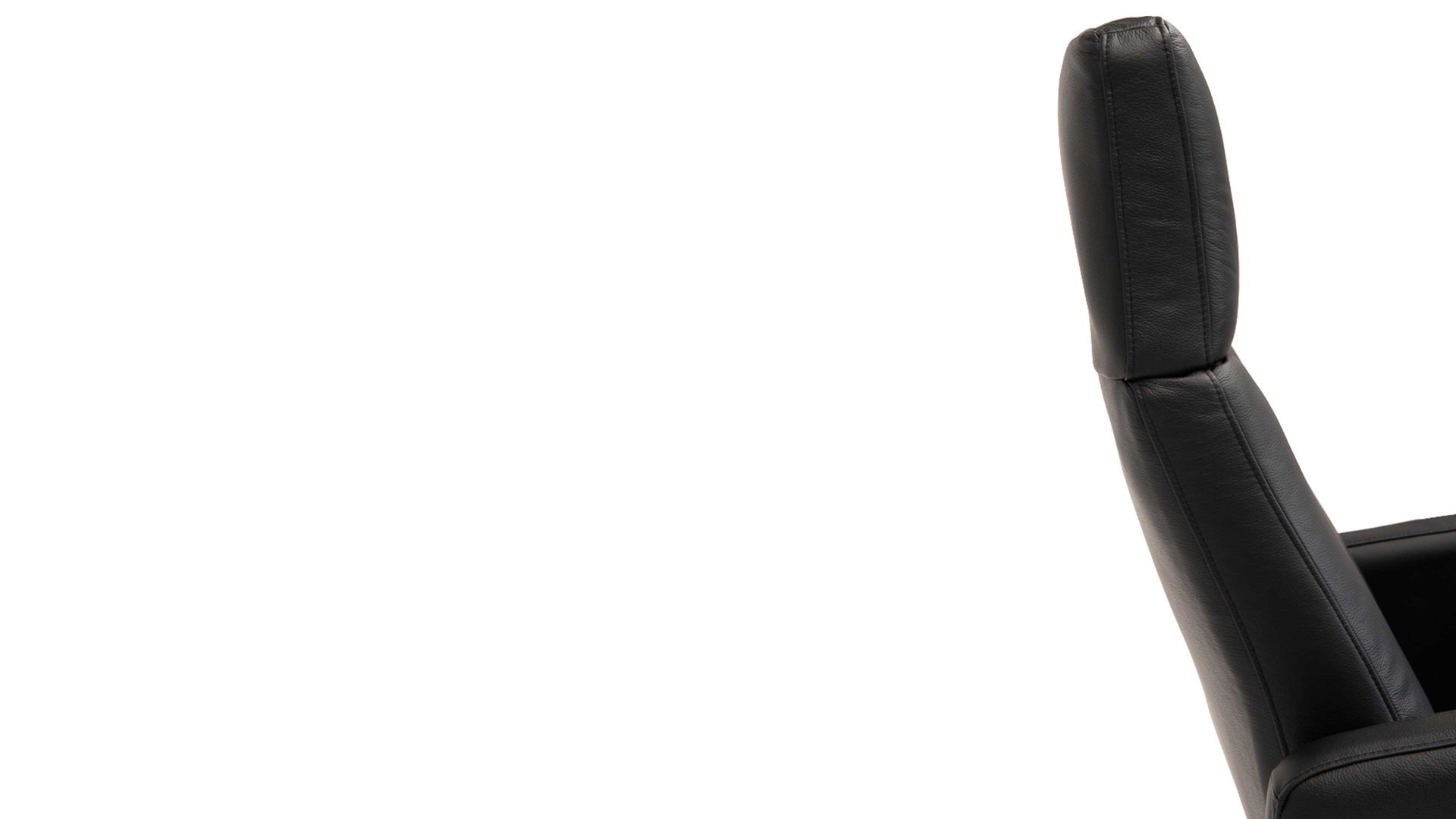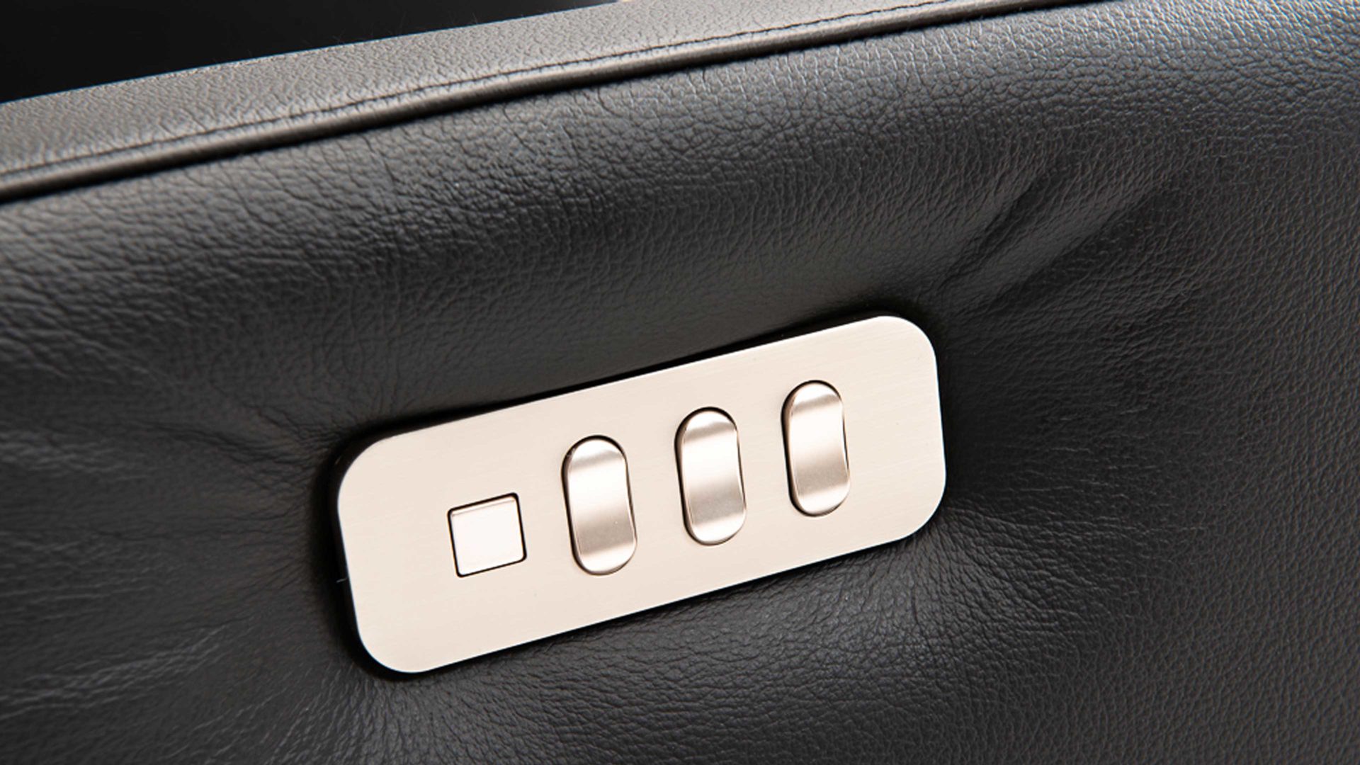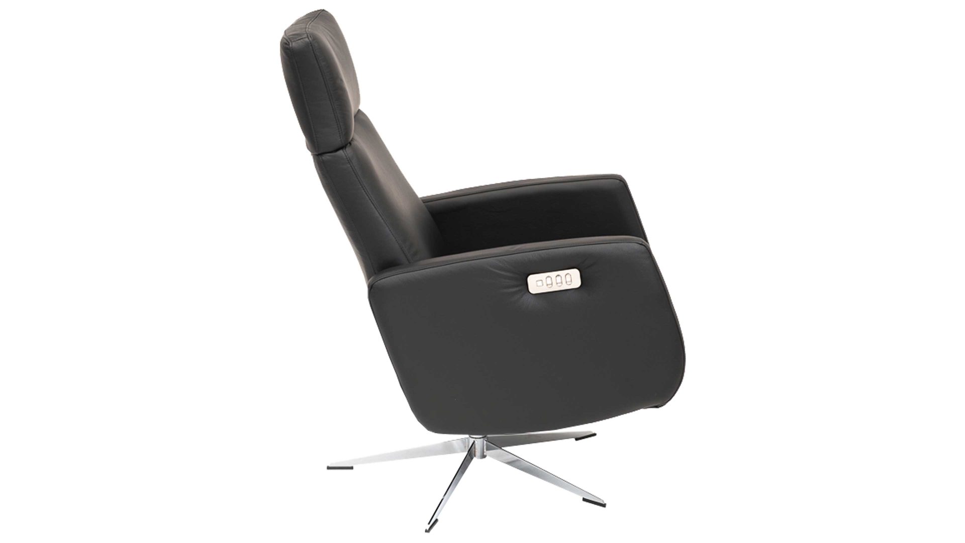 Drehsessel mit getrennten motorische Relaxfunktionen, bedienbar über ein außenliegendes silberfarbenes Control-Panel