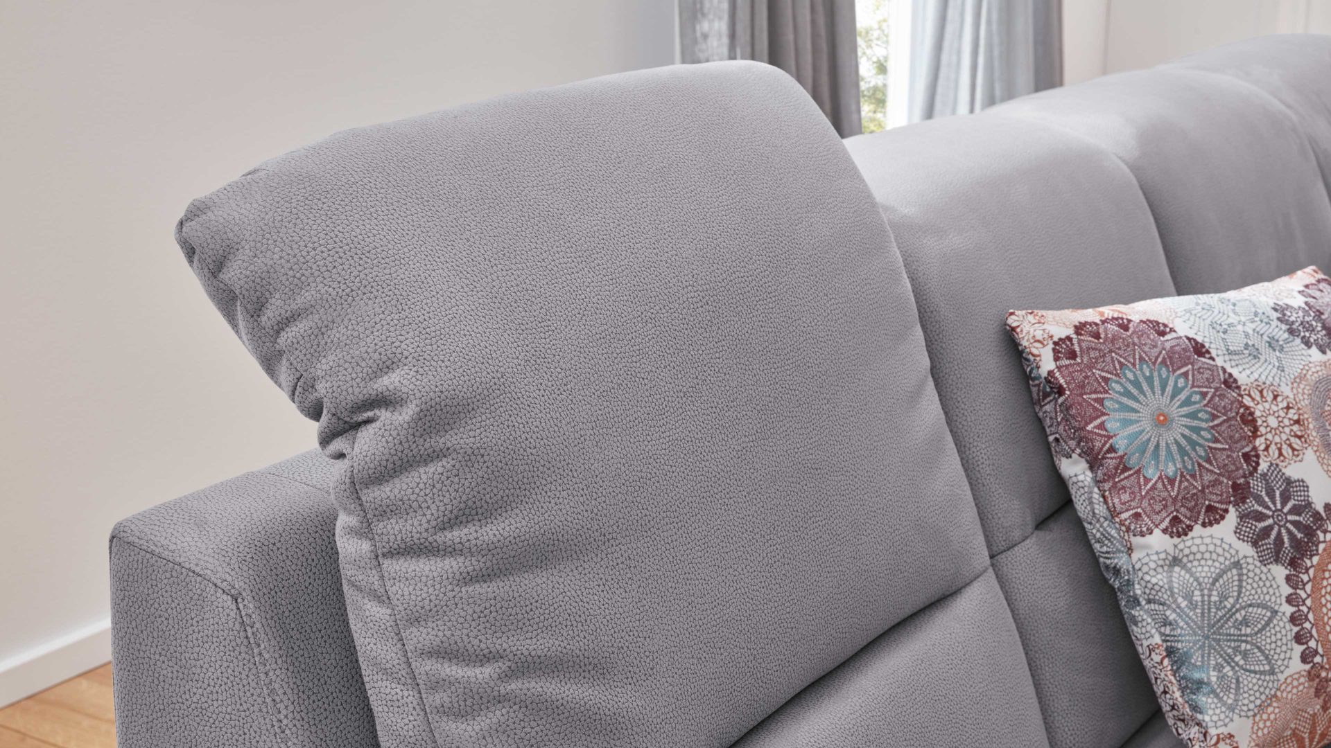 Dank des geprägten grauen Mikrofaserbezugs und der schwarzen Holzfüße ist das Sofa ein Hingucker in Ihrem Wohnbereich. Dabei setzt sich die Polsterarnitur aus einem 3-Sitzer Sofa mit Armlehne links, einer Rundecke und einer 2-Sitzer Couch mit Armlehne rechts zusammen. Die Rückseite der Garnitur ist mit Stoff bezogen.
