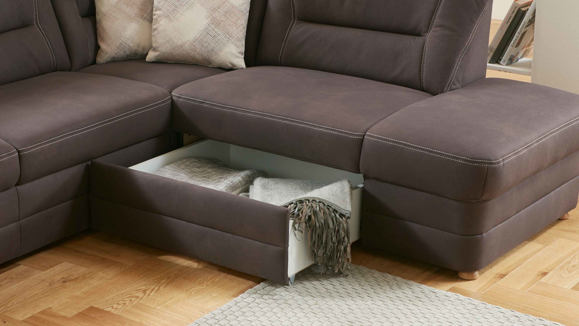 Bei der Schublade handelt es sich um einen äußerst praktischen Funktions-Mehrpreis für bestimmte Möbel aus dem Modulmaster-Polsterprogramm MM-PP1067. Der Auszug weist eine stoffbezogene Front auf und ist innen puristisch weiß beschichtet. In der Stauraumschublade haben Sie etwa Platz für Wohntextilien oder Spielzeug.