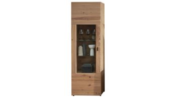 eintürige Vitrine mit Glastür, dahinter zwei Glasböden und zwei Holzböden