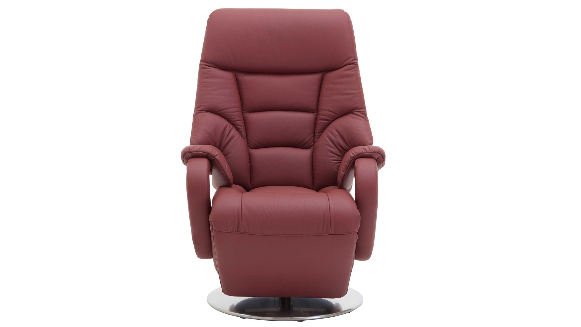 Dieser Relaxsessel kombiniert einen robusten glänzenden Edelstahl-Tellerfuß mit einem stilvollen merlotfarbenen Lederbezug. Durch die optimal aufeinander abgestimmten Materialien und Farben strahlt der Fernsehsessel moderne Eleganz aus. Für die nötige Stabilität sorgt der Stahlrohrrahmen. Er macht den TV-Sessel bis 130 kg belastbar. Die Maße des hochwertig verarbeiteten Relaxsessels belaufen sich auf ca. 80 x 116 x 80 cm (BxHxT), bei einer Sitzhöhe von ca. 49 cm und einer Sitztiefe von ca. 55 cm.