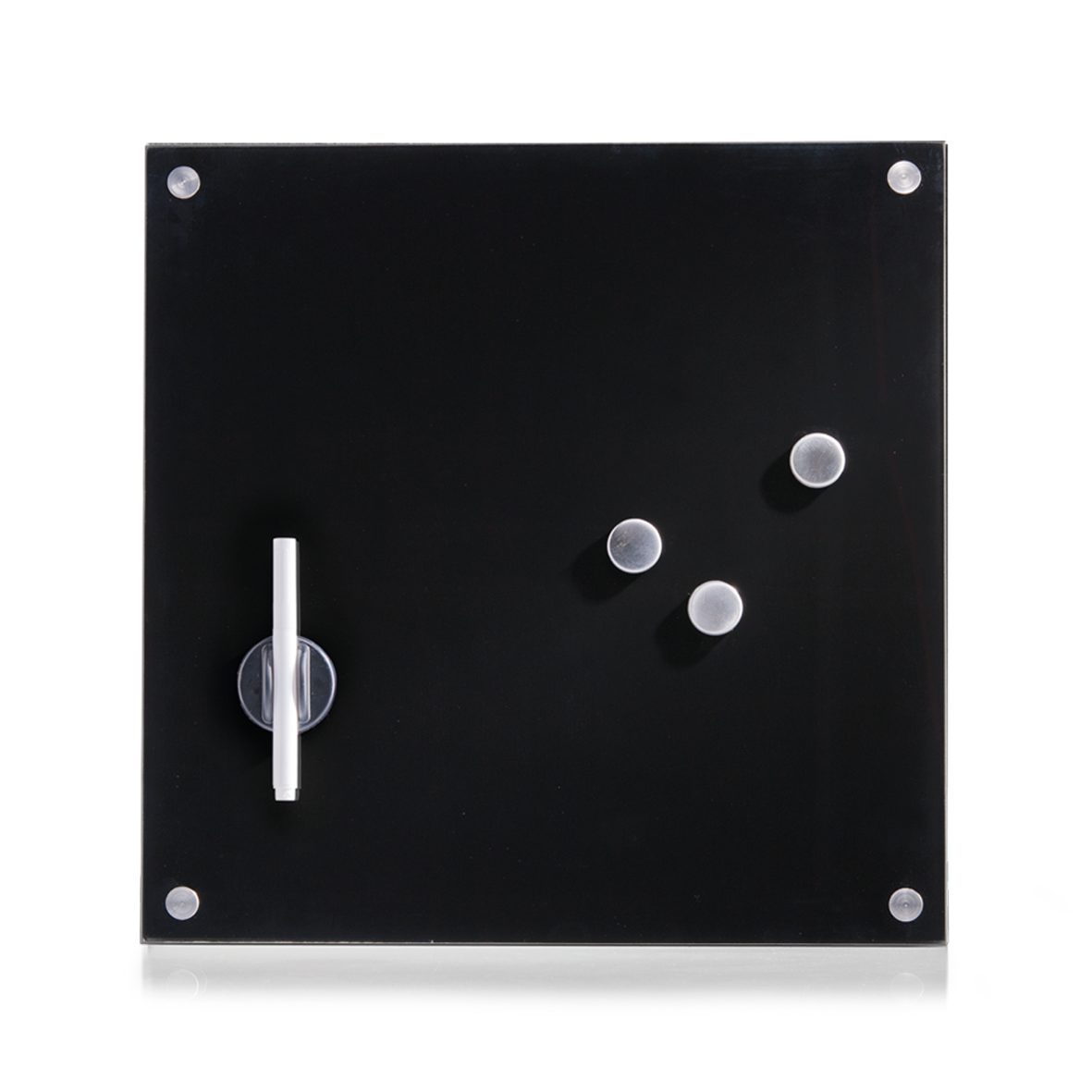 Dieses hochwertige Memobord aus schwarzem Glas verbindet Funktionalität und einzigartiges Design, die perfekte Ergänzung für moderne Einrichtungskonzepte. Ob in Ihrem Büro, in der Küche oder im Flur, das dekorative Memobord ist ein wahrer Hingucker. Dank der beschreibbaren Glasoberfläche und dem mitgelieferten Stift, können Sie Ihre wichtigen Termine notieren. Mit einem Wisch ist Ihr Geschriebenes auch wieder weg. Postkarten, Notizzettel oder Fotos geraten nie mehr in Vergessenheit, denn diese können einfach mit den Magneten befestigt werden.