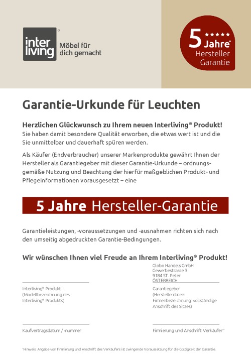 Alle Leuchten dieser Serie bieten 5 Jahre Herstellergarantie – für langlebige Freude an stilvollem Licht.