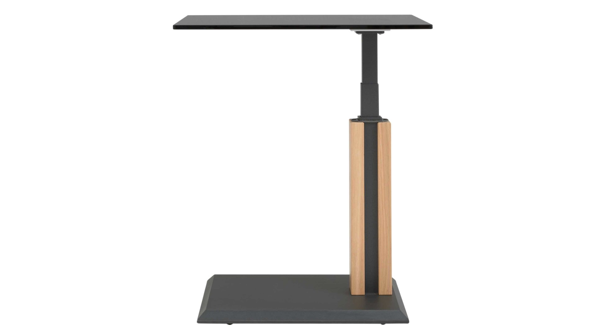 Mit Maßen von ca. 55 x 47–65 x 47 cm (BxHxT) ist der Tisch kompakt, vielseitig und harmoniert perfekt mit modernen Wohnumgebungen. Alternativ ist er auch mit einer perlsilberfarbenen Bodenplatte und einer Klarglas-Tischplatte erhältlich – für eine hellere, luftigere Raumwirkung.