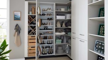 Verschiedene Schrankelemente, offene Bereiche und durchdachte Aufteilungen ermöglichen es Ihnen, Reinigungsutensilien, Vorräte, Wäsche und Alltagsgegenstände übersichtlich zu verstauen.