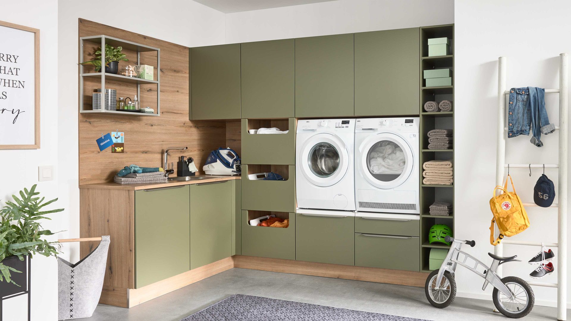 Interliving Küche Serie 3074 – stilvolle Hauswirtschaftsraumlösung in Olivgrün und Vulkaneiche für Ordnung und Wohnlichkeit