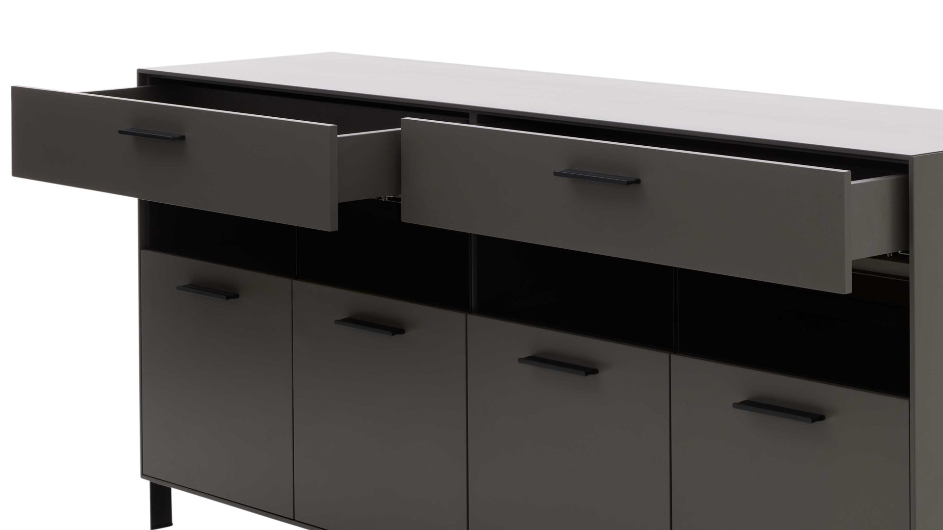 Das Sideboard aus der Interliving Wohnzimmer Serie 2030 vereint moderne Ästhetik mit intelligentem Stauraumkonzept – ideal als elegantes Solitärmöbel im Wohn- oder Essbereich. Die wolframgrauen Lackoberflächen verleihen dem Möbelstück eine stilvolle, edle Ausstrahlung. Einsätze aus grauem Parsolglas, sichtbare Rückwände mit Spaltholz auf schwarzer MDF und filigrane Metallelemente in feinstrukturierter schwarzer Lackierung setzen raffinierte Akzente und unterstreichen den modernen Charakter der Serie.