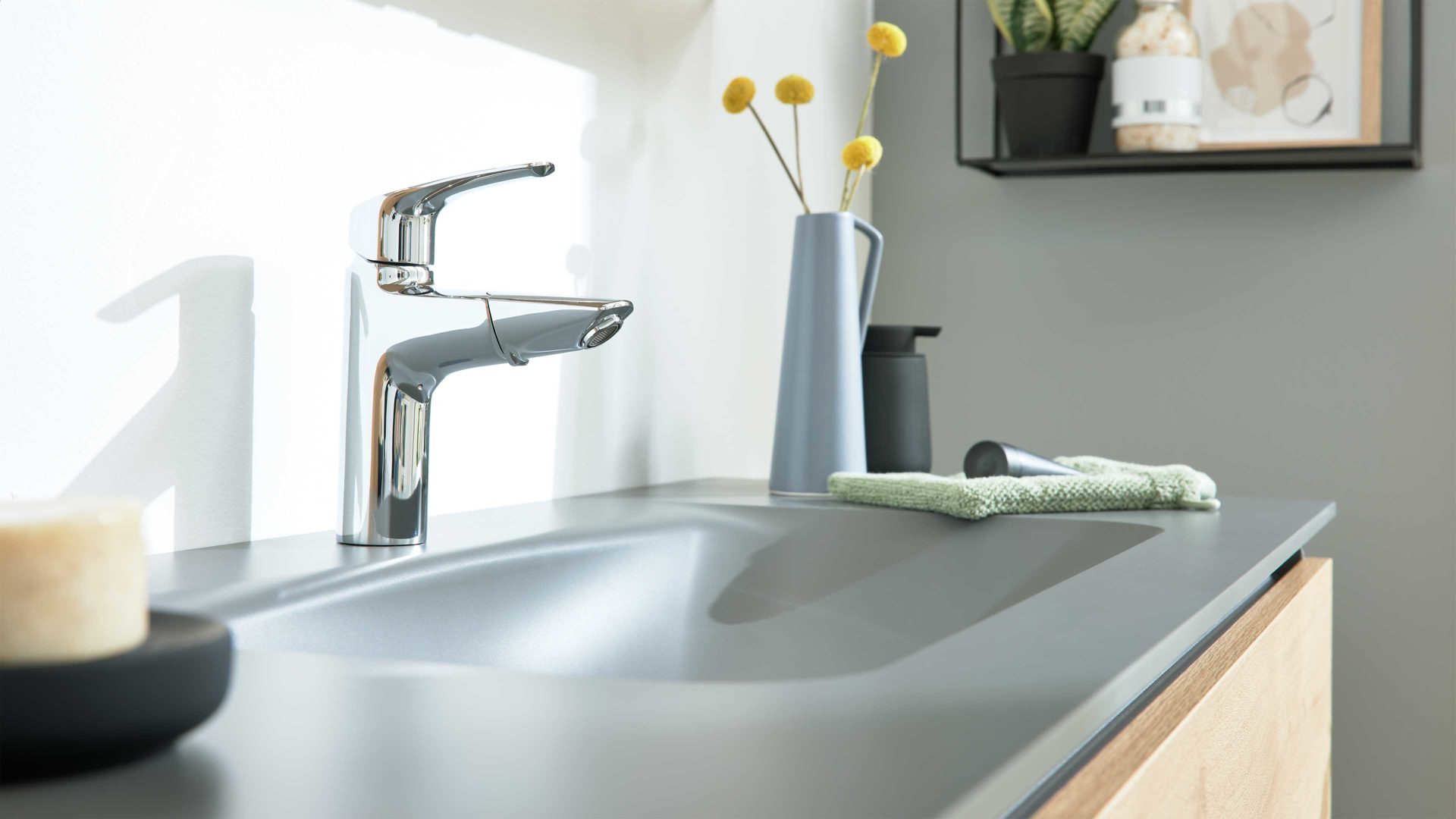 Ein echtes Highlight ist der schiefergraue Duratek® Waschtisch (Typ 87724). Das innovative Vollacryl-Verbundmaterial vereint Quarz, keramische Nanopartikel und moderne Acrylharze zu einer ultrakompakten Oberfläche mit seidig-mattem Finish. Die »Samt«-Touch-Oberfläche ist pflegeleicht, kratz- und stoßfest, farbstabil und vermittelt ein besonders edles, haptisches Erlebnis. Maße: ca. 121 x 12 x 49 cm (B/LxHxT), mit Hahnlochbohrung, ohne Überlauf.