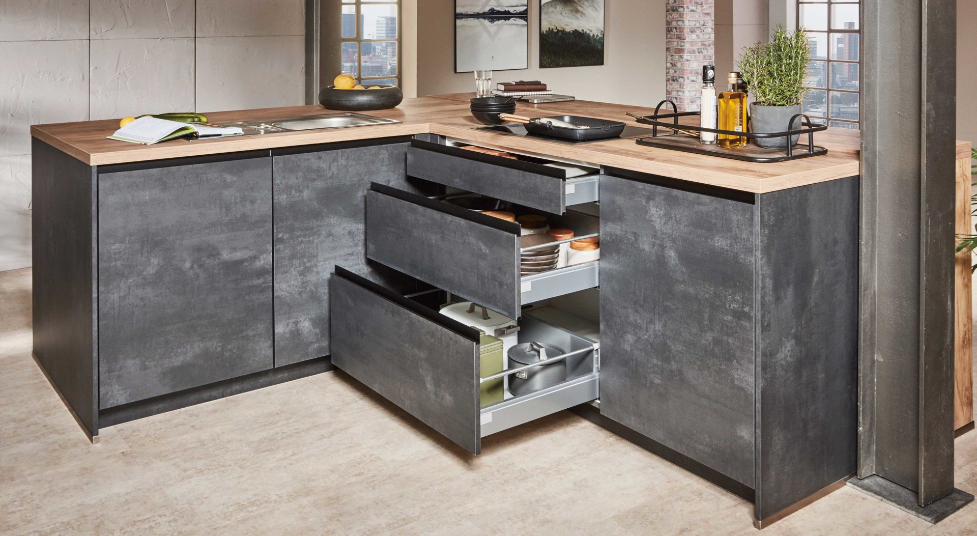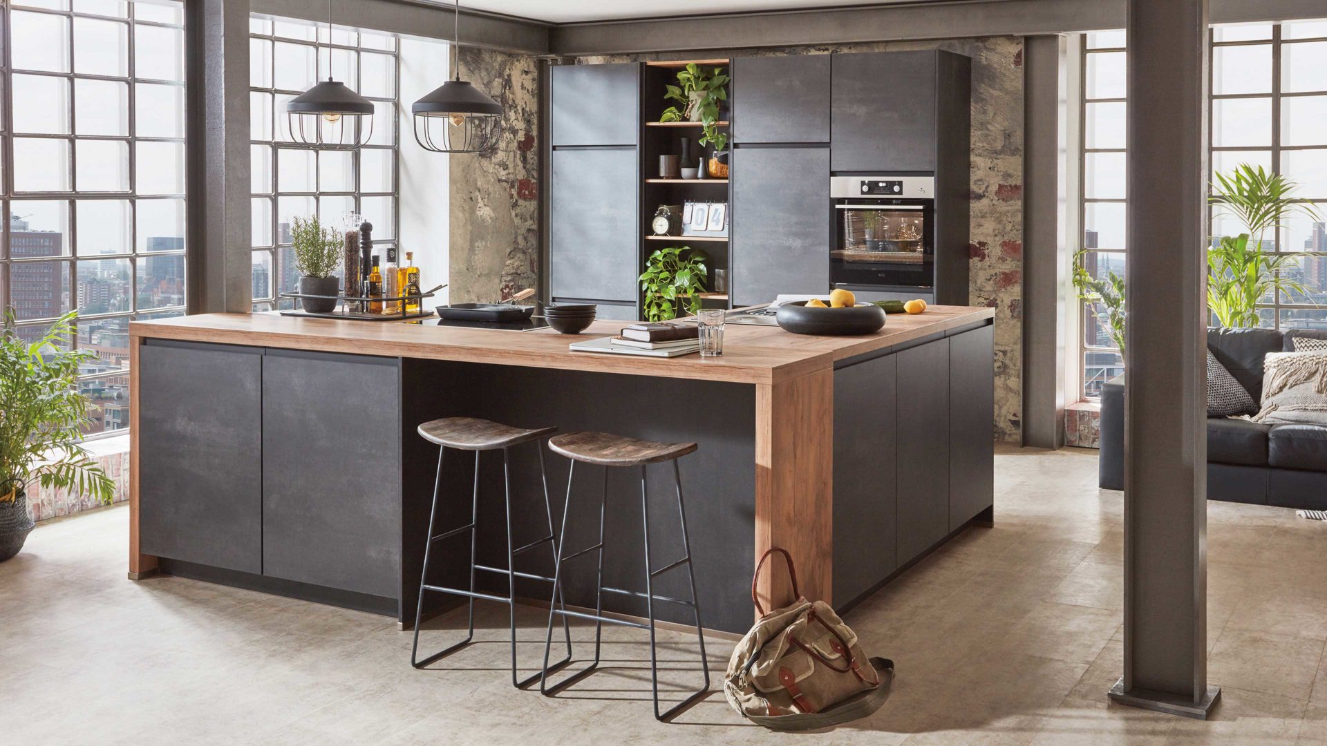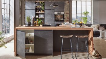 Die nobilia® Einbauküche Laser begeistert mit ihrem wilden Industrie-Look, der exzellenten Verarbeitung und der hohen Funktionalität. Sie kombiniert schwarzbetonfarbene Fronten mit Taxus-Nachbildung. Der Korpus und die Sockelblenden sind ebenfalls im speziellen Schwarzbetonton gestaltet, während die Arbeitsplatten und Sichtseiten die warme Taxusnuance aufgreifen. Akzentuierend wirkt die grifflose Frontgestaltung.