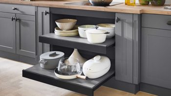 Schwarze Metallknöpfe als Griffe runden das moderne Landhaus-Design stilvoll ab.