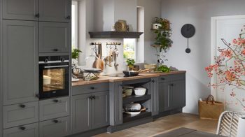 Die nobilia® Einbauküche Nordic kombiniert mattes Schiefergrau als echte Trendfarbe mit einer Arbeitsplatte in Taxus-Nachbildung, die warmen Naturcharme verströmt.