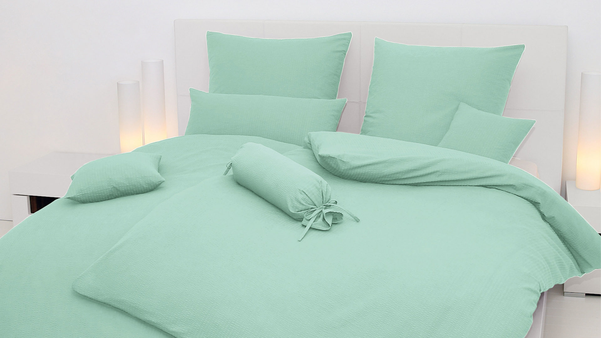Edle Mako-Soft-Seersucker-Bettwäsche der Marke Janine® in hellgrün in der Größe ca. 135 x 200 cm, ein Kissenbezug ca. 80 x 80cm. Das Modell Piano 0125 ist in einem schlichten, unifarbenen Dessin angelegt und in vielen Farben erhältlich. Der eingenähte Reißverschluss dient einer bequemen Handhabung. Mit der verdeckten Verschlussleiste hat das aufgezogene Bett immer einen sauberen Abschluss. Die Bettwäsche ist leicht zu pflegen und garantiert Ihnen einen angenehmen Schlafkomfort. Die Bettwäsche ist bis 60 Grad waschbar und trocknergeeignet.