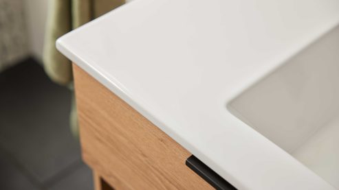 Die Melaminfronten mit ABS-Kanten sind besonders robust: kratzfest, stoßfest, wasserabweisend, lichtbeständig und pflegeleicht – ideal, wenn du langlebige Badmöbel suchst, die ihren schönen Look auch im Alltag behalten.