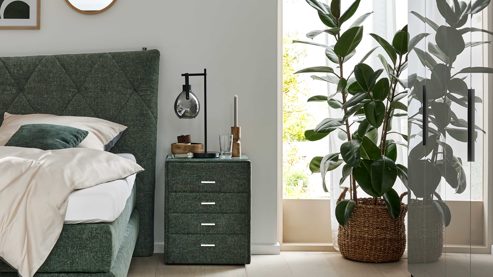 Stilvolle Ordnung in moosgrünem Design mit der Nachtkommode aus der Interliving Bettensystem Serie 1420 - Einzelkommode trifft Design und Funktion