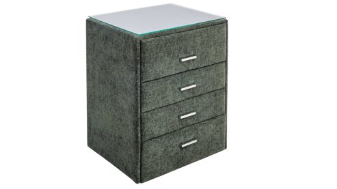 Der weiche Stoffbezug mit feiner Struktur sorgt für eine warme, wohnliche Atmosphäre. Die Kombination mit der transparenten Glasplatte wirkt hochwertig und modern – ideal für ein gemütliches und gleichzeitig elegantes Schlafzimmer. Vier leichtgängige Schubladen mit chromfarbenen Griffen bieten dir viel Platz für Alltagsgegenstände, Kleidung oder Accessoires. So schaffst du ganz einfach Ordnung mit Stil.