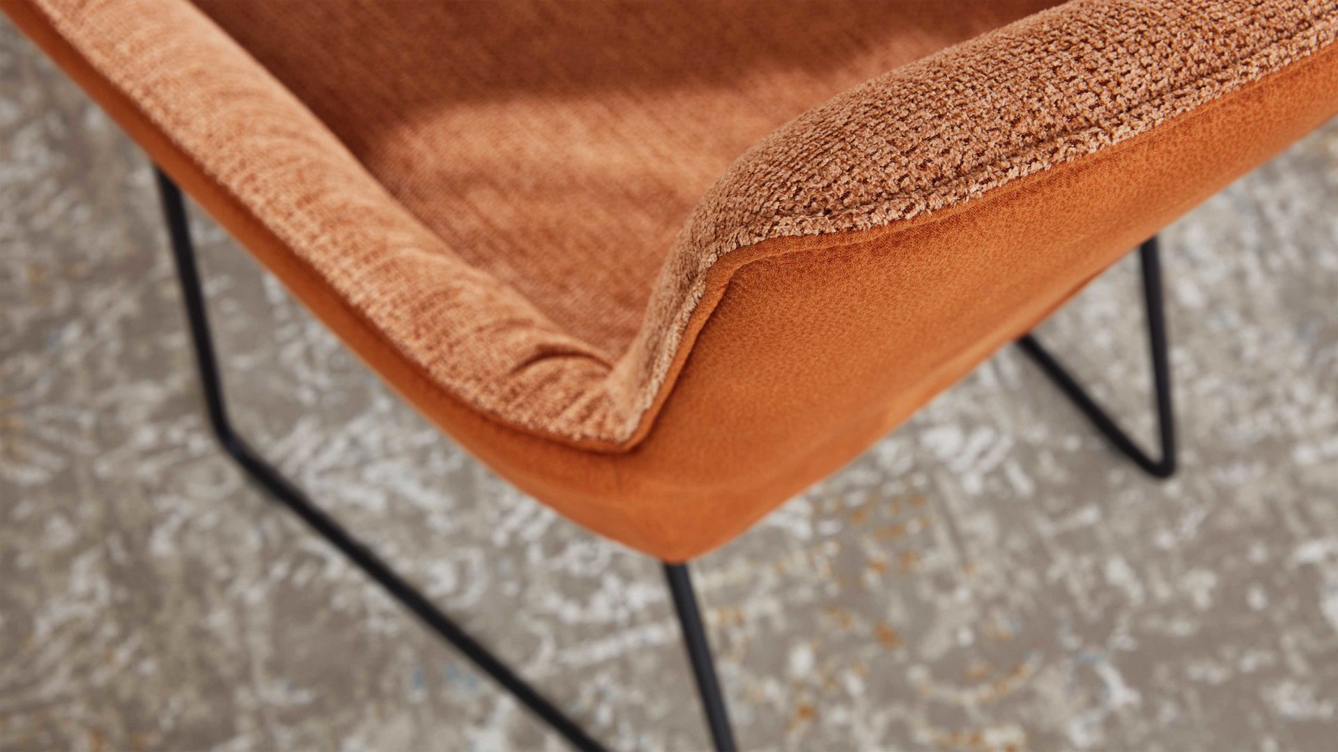 Der moderne Schalensessel 9032-04-956 aus der Interliving Esszimmer Serie 5111 kombiniert ein schwarzes Eisen-Kufengestell mit einer stilvollen cognacfarbenen Bezugkombination.