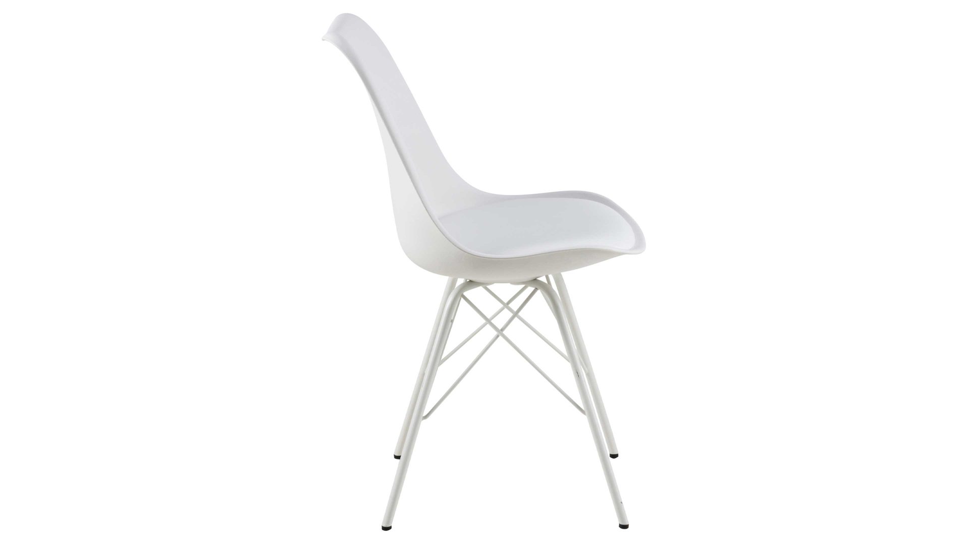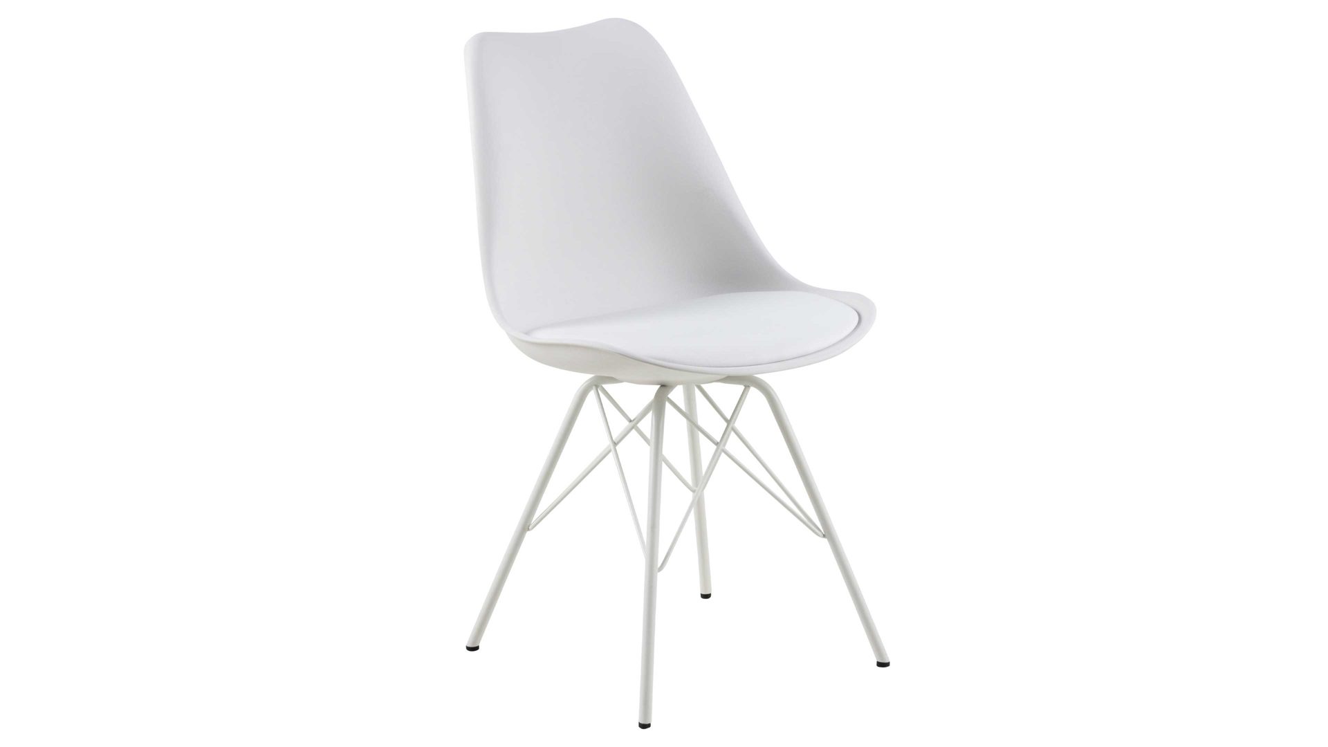 Dieser Polsterstuhl verkörpert schlichte Eleganz. Seine stabile, dabei aber wunderbar filigran designte Basis bildet ein mattweiß pulverbeschichtetes Stahldrahtgestell. Darauf befindet sich eine weiße Sitzschale aus robustem Kunststoff. Sie ist mit weißem Kunstleder bezogen, das sowohl qualitativ als auch optisch und haptisch überzeugt. Die Farbgebung sorgt für eine klassische Ausstrahlung.