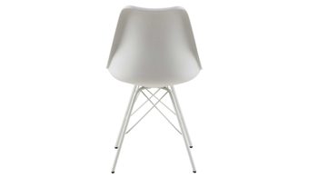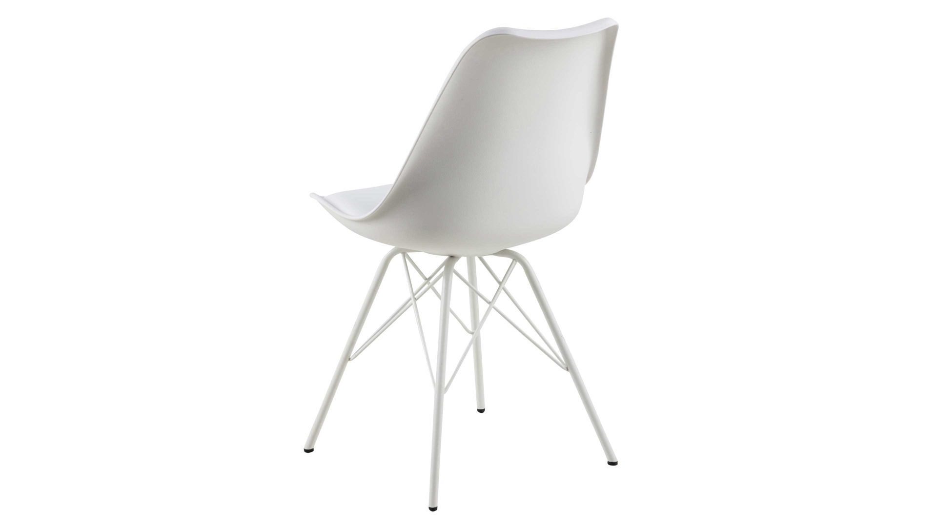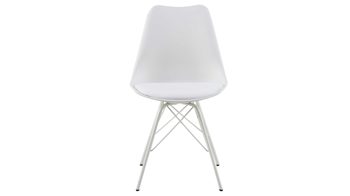 Dieser Polsterstuhl verkörpert schlichte Eleganz. Seine stabile, dabei aber wunderbar filigran designte Basis bildet ein mattweiß pulverbeschichtetes Stahldrahtgestell. Darauf befindet sich eine weiße Sitzschale aus robustem Kunststoff. Sie ist mit weißem Kunstleder bezogen, das sowohl qualitativ als auch optisch und haptisch überzeugt. Die Farbgebung sorgt für eine klassische Ausstrahlung.
