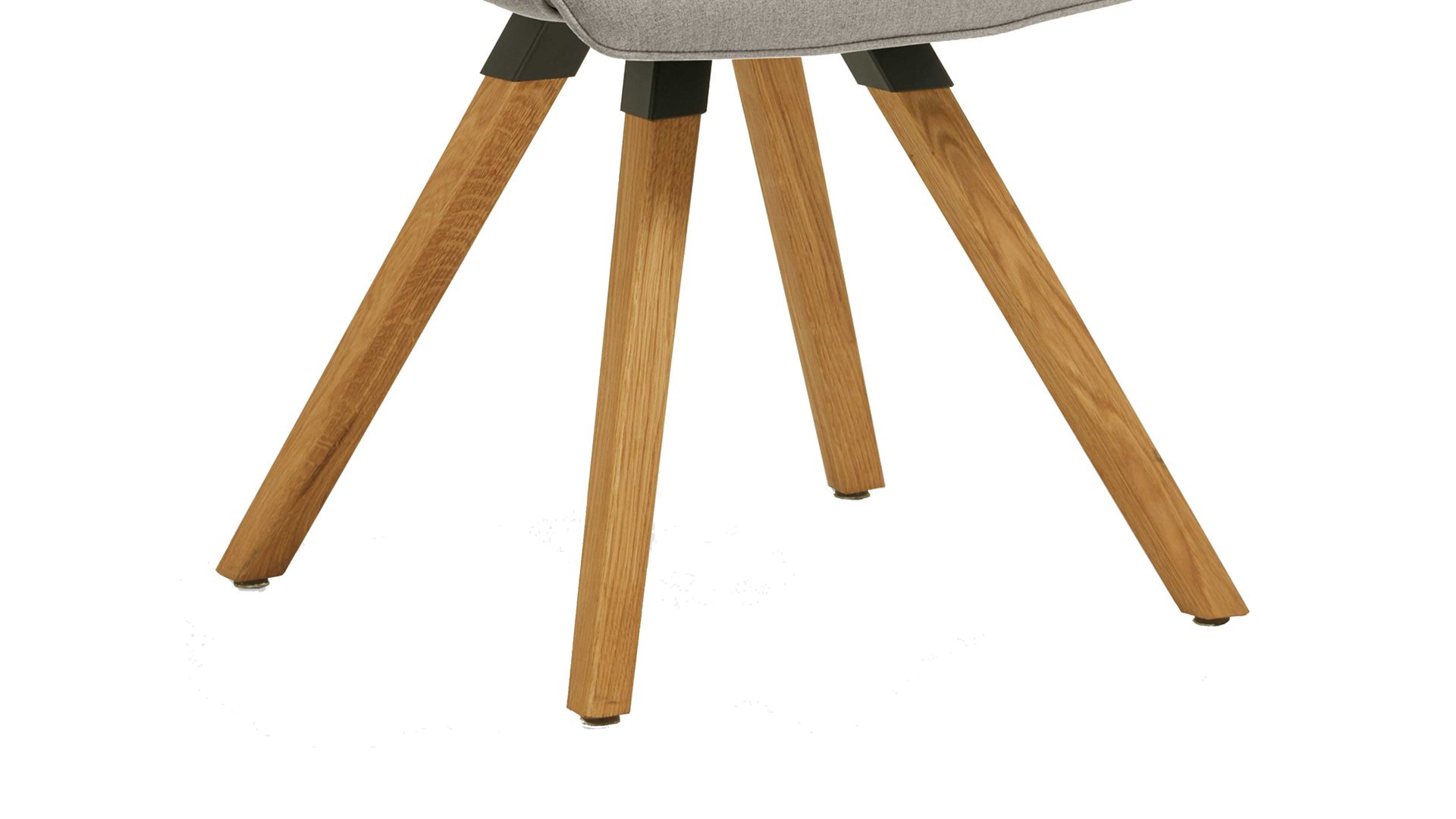 Der Armlehnstuhl Merlot präsentiert sich modern, kreativ und stilvoll designt. Er kombiniert einen silberfarbenen Webstoffbezug mit einem Stativ-Gestell aus massivem Wildeichenholz und schwarzen Akzenten. Das Echtholz sorgt für eine stabile Basis sowie für natürliches und warmes Flair im Esszimmer. Einen kühlen Kontrast erwirkt der puristische Farbton des hochwertigen, angenehm weichen Stoffbezugs. Überdies unterstreicht die spezielle Formensprache des Gestells die originelle Ausstrahlung des Vierfußstuhls.