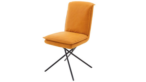 sonnengelber Lederbezug mit einer beigen Kontrastnaht und mattschwarzen Metallfüßen