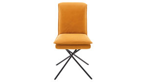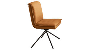 Er kombiniert ein mattschwarz lackiertes Stativgestell aus robustem Eisen mit einem cognacfarbenen Mikrofaserbezug in Lederoptik und fügt sich in verschiedene Wohnstile harmonisch ein. Zu den optischen Highlights des Esszimmerstuhls gehört neben der Formensprache und den perfekt aufeinander abgestimmten Farben der markante Quereinzug im Rücken.