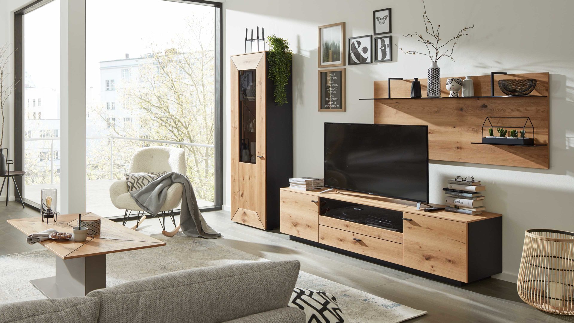 Mit der Wohnwand IW1 aus der Interliving Wohnzimmer Serie 2022 statten Sie Ihre Inneneinrichtung mit natürlicher Eleganz aus. Honigfarbenes Balkeneiche-Edelfurnier trifft auf seidenmatten Lack in Anthrazit. Ebenfalls anthrazitfarben fügen sich die Metallgriffe harmonisch in das edle Gesamtbild ein.