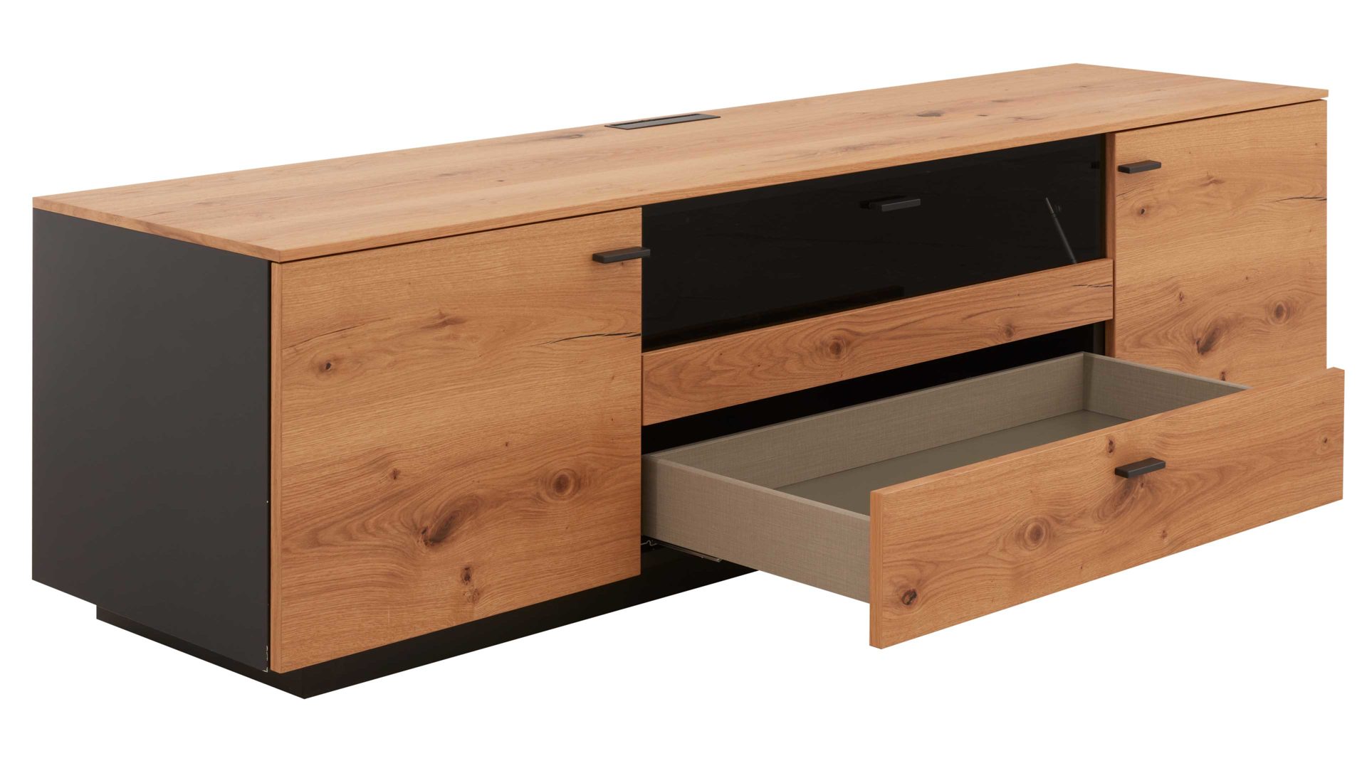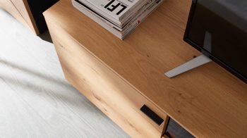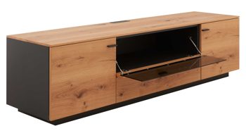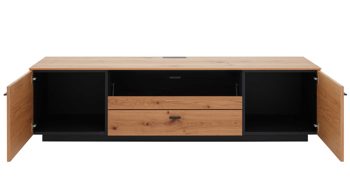 Um noch mehr Stauraum ergänzt das zweitürige Lowboard LB6 mit Maßen von ca. 165 x 51 x 49 cm (BxHxT) die Wohnzimmermöbel. Es ist mit einer zusätzlichen Klapptür mit schickem Glaseinsatz versehen. Hinzu kommt eine große Schublade. Ein Kabeldurchlass im Oberboden ist inklusive.
