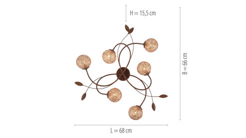 Die Paul Neuhaus LED-Deckenleuchte Greta leuchtet Ihren Wohnbereich wunderbar aus und fungiert zugleich als ansprechendes Dekoelement. Gefertigt aus rostfarbenem Metall in Kombination mit goldfarbenen Lampenschirmen beeindruckt die raffinierte Leuchte gleich auf den ersten Blick. Statten Sie die Deckenlampe einfach mit sechs G9-Leuchtmitteln mit je 40 Watt aus, die sich für die Energieeffizienzklasse A bis G eignen, und nehmen Sie das Lampenmodell direkt in Betrieb.