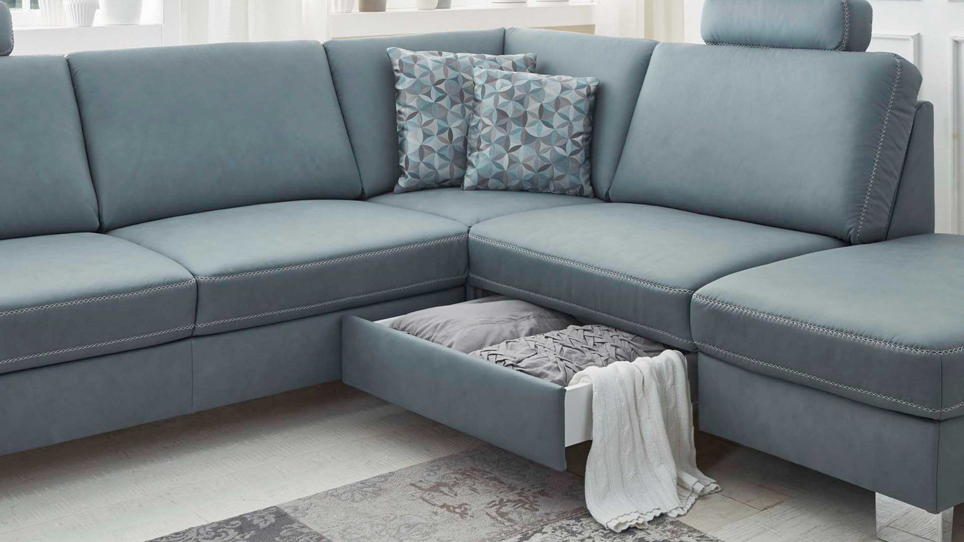 Beispielsweise sind die attraktiven Bezüge mit und ohne Kontrastnaht umsetzbar. Dazu stehen Ihnen sechs Fußvarianten zur Wahl. Des Weiteren sind zwei bequeme Sitzqualitäten preisgleich erhältlich: Federkern (fest) oder Kaltschaum (soft). Sie wählen überdies zwischen zwei preisgleichen Sitzhöhen und können optional mehrere manuelle oder motorische Funktionen ergänzen.