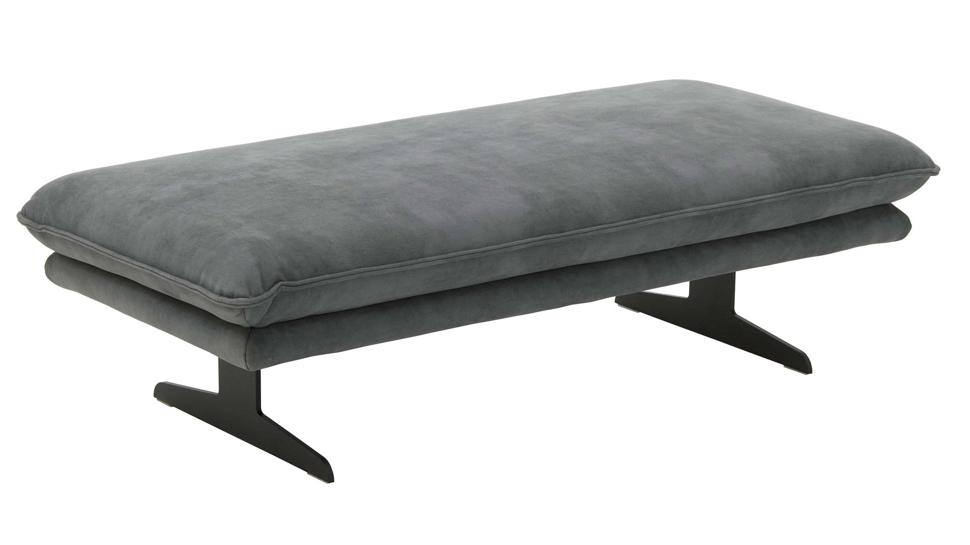 Der moderne XXL-Hocker aus der W.SCHILLIG Polsterserie Broadway bringt luxuriöses Flair und vor allem jede Menge Komfort in Ihr Wohnzimmer. Optisch begeistern der elephantgraue Stoffbezug mit Biese sowie die mattschwarz pulverbeschichteten Metall-Kufenfüße, deren filigrane Umsetzung dem Hocker eine leichte und offene Ausstrahlung verleiht. Die Farben sind perfekt aufeinander abgestimmt.