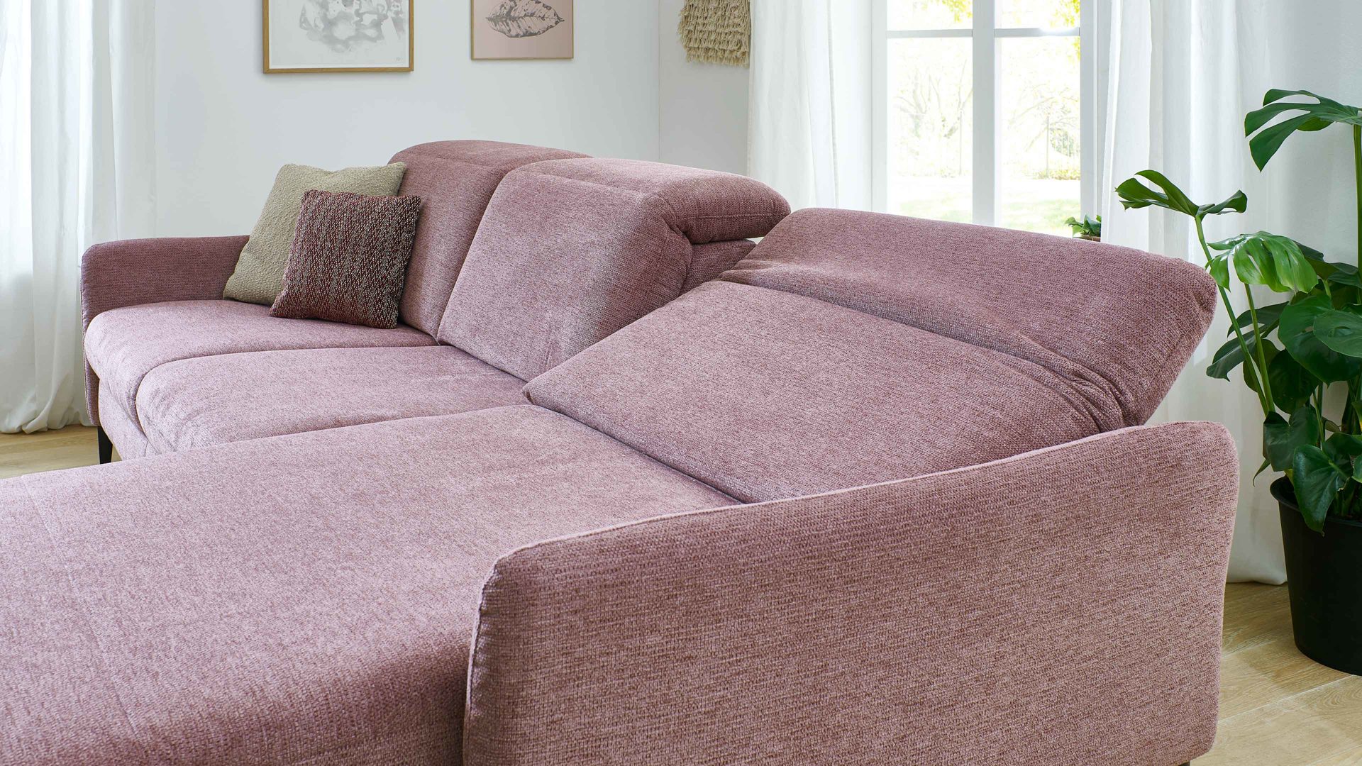 Zu den Highlights des Polsterprogramms gehören die grundsätzlich im Originalstoff bezogenen Rückseiten, die bei allen Elementen enthaltene Kopfpolsterverstellung sowie die für Staubsaugerroboter ideale Bodenfreiheit. Die Serie ist Made in Europe und mit dem Goldenen M ausgezeichnet.