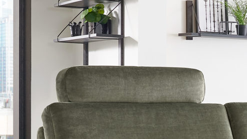 Mit weichem Kaltschaum gepolstert und trendig-olivfarbenem Mikrovelours bezogen, gewährleistet das Kopfpolster die gewünschte Bequemlichkeit und harmoniert perfekt mit den Polstermöbeln im gleichen Design. Das Steckelement besteht aus robustem verchromten Metall.