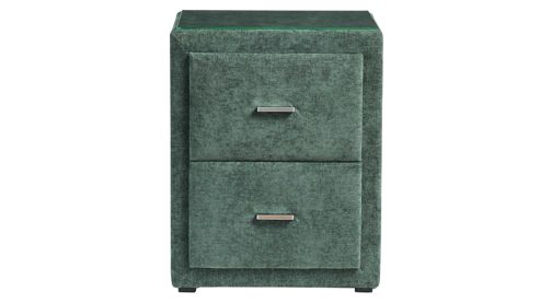 Der moosgrüne Chenillebezug verleiht der Nachtkonsole eine warme, wohnliche Ausstrahlung und sorgt gleichzeitig für eine angenehme Haptik. Die elegante Klarglasauflage setzt einen modernen Akzent und schützt die Oberfläche – ideal für Lampe, Bücher oder dein Smartphone.