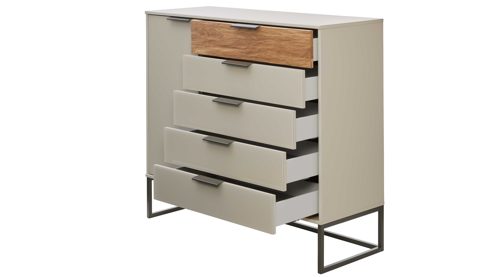 Mit Maßen von ca. 120 x 105 x 43 cm (B/LxHxT) bietet dir diese Schlafzimmerkommode ausreichend Platz für Kleidung, Wäsche oder Accessoires. Die Kombikommode überzeugt mit einer cleveren Innenaufteilung, die dir maximale Flexibilität bietet. Hinter der Tür befindet sich ein praktischer Stauraumbereich mit einem verstellbaren Einlegeboden, rechts bieten fünf Schubladen mit Softclose und Selbsteinzug weiteren Platz.