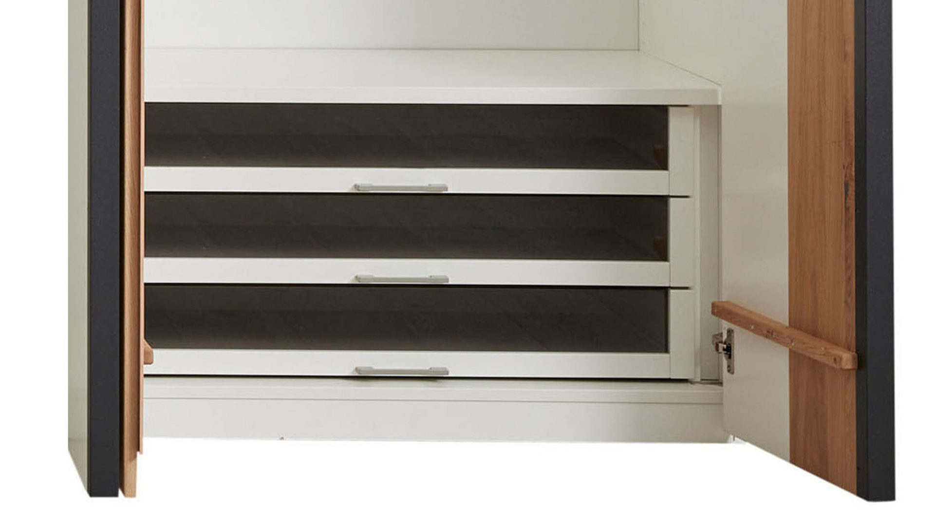 Die Innenschubladen aus der Interliving Schlafzimmer Serie 1019 sind ein cleveres Mehrpreis-Zubehör, das deinen Kleiderschrank sofort übersichtlicher macht. Das Schubladen-Set besteht aus drei großzügigen Schubladen mit weißen Lackoberflächen und Fronten mit elegantem Glaseinsatz. Edelstahlfarbene Metallgriffe runden den modernen Look stilvoll ab.