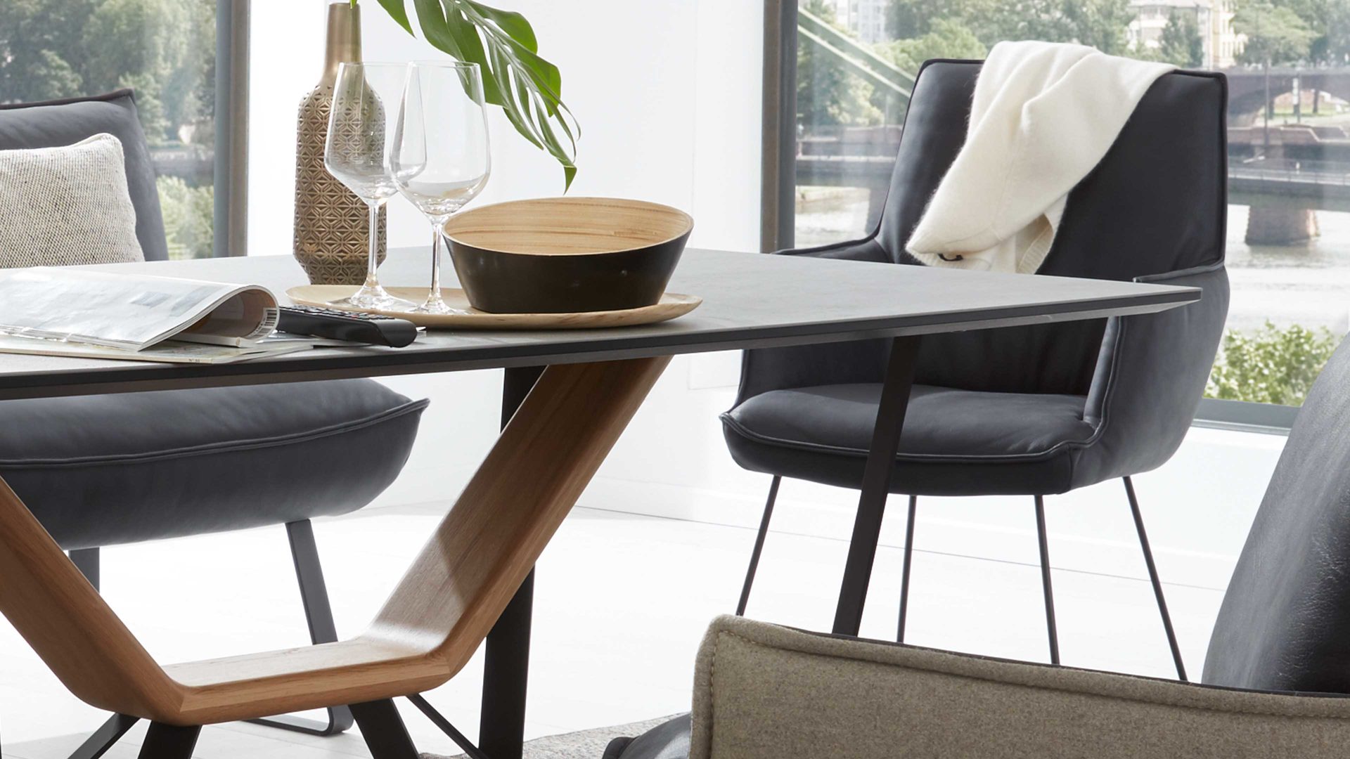 Als Basis fungiert ein mattschwarz pulverbeschichtetes Metall-Winkelgestell mit Struktur. Die Sitz- und Rückenfläche des qualitativ hochwertigen Esszimmerstuhls sind mit dunklem Leder bezogen, das extravagante Tiefgründigkeit und jede Menge Gemütlichkeit ausstrahlt.