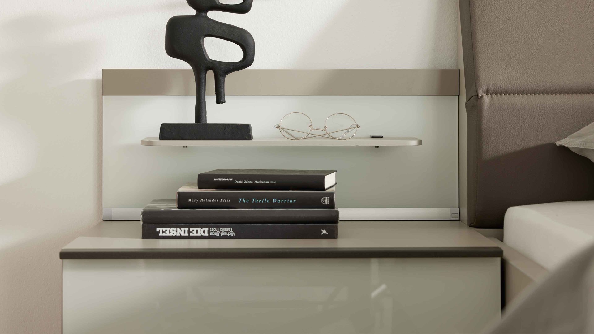 Die Kombination aus kieselgrauen und weißen Kunststoffoberflächen mit weißen Glasauflagen harmoniert perfekt mit der integrierten LED-Beleuchtung. Die fest verbauten LED-Leuchtmittel mit der Energieeffizienzklasse F (Spektrum A bis G) sorgen für ein dezentes, warmes Licht direkt am Bett. Über den praktischen Kippschalter steuerst du die Beleuchtung ganz bequem.