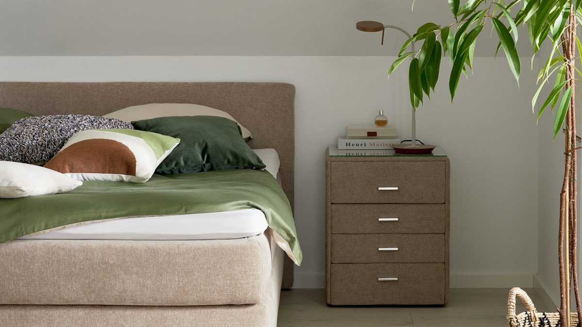 Kombiniere die Nachtkommode idealerweise mit dem passenden Polsterbett der Serie, um ein stimmiges Gesamtbild zu erzielen.